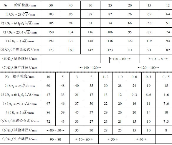 (6)與試驗(yàn)球徑相比,公式(5-39)的結(jié)果與試驗(yàn)結(jié)果很接近,特別是給礦粒度3mm以下二者個分接近。上述6點(diǎn)分析結(jié)果說明,球徑半理論公式的計(jì)算結(jié)果比表(5-39)中的任何一個經(jīng)驗(yàn)球徑公式的計(jì)算結(jié)果精確。