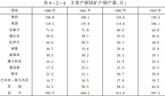 目前世界上采銅國(guó)家已有57個(gè),但資本主義世界主要礦產(chǎn)銅生產(chǎn)國(guó)約11個(gè)(表9-2-4),其中美國(guó)、智利、加拿大和贊比亞為四個(gè)較大產(chǎn)銅國(guó),約占資本主義世界礦產(chǎn)銅總產(chǎn)量的60%左右。除上述四國(guó)外,再加扎伊爾、秘魯、菲律賓和澳大利亞,約占資本主義世界礦產(chǎn)銅總量的83%。